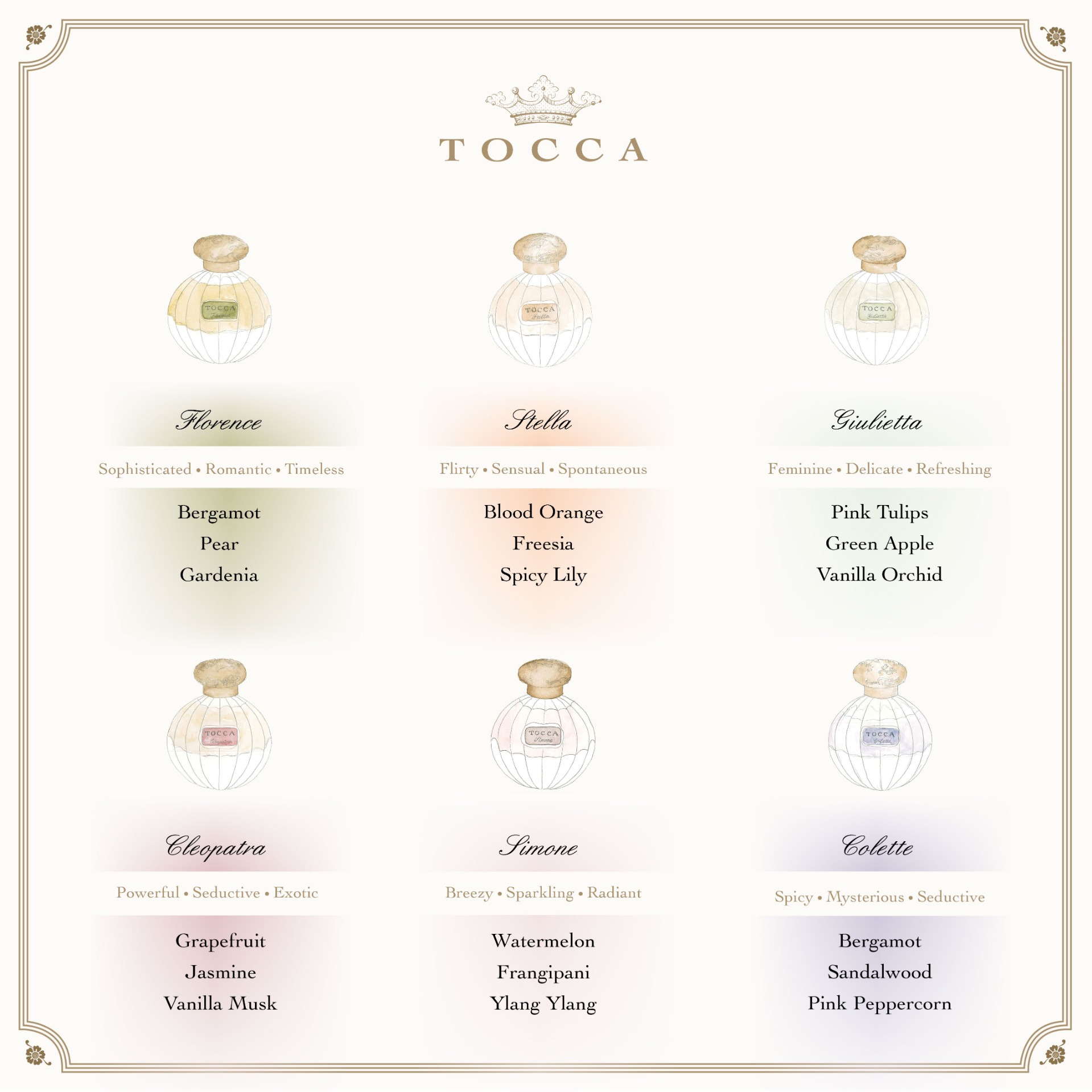 Tocca má na Fragrantice v portfoliu 24 vůní, ale ve FaNNu jich naleznete jen šest. Každá z nich má ztělesňovat jednu ženskou stránku: