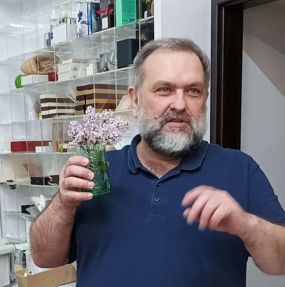 Když se rozpovídal o obsahu pro nás tajemných flaštiček ve varhanech, úplně se rozzářil. Mohly jsme vyzkoušet téměř hotový jím vytvořený akord frézie a také šeříku. Šeřík teď ladí podle své paměti i podle skutečné čerstvě utržené kytice. Protože však nikdo nestojí o čistý soliflor (i když ten, který byl k dostání za komunistů, prý měl moc rád), musí být přidány další složky. Podle libosti tak můžete vypravit parfém velmi různými směry. Pro ilustraci šeřík hned doplnil oblou dřevitou vůní s nádechem kokosu, čehož docílil přimísením několika esencí - z mnoha jsem si zapamatovala pouze dva různé santaly, molekulu Lilybelle a Iso E Super.