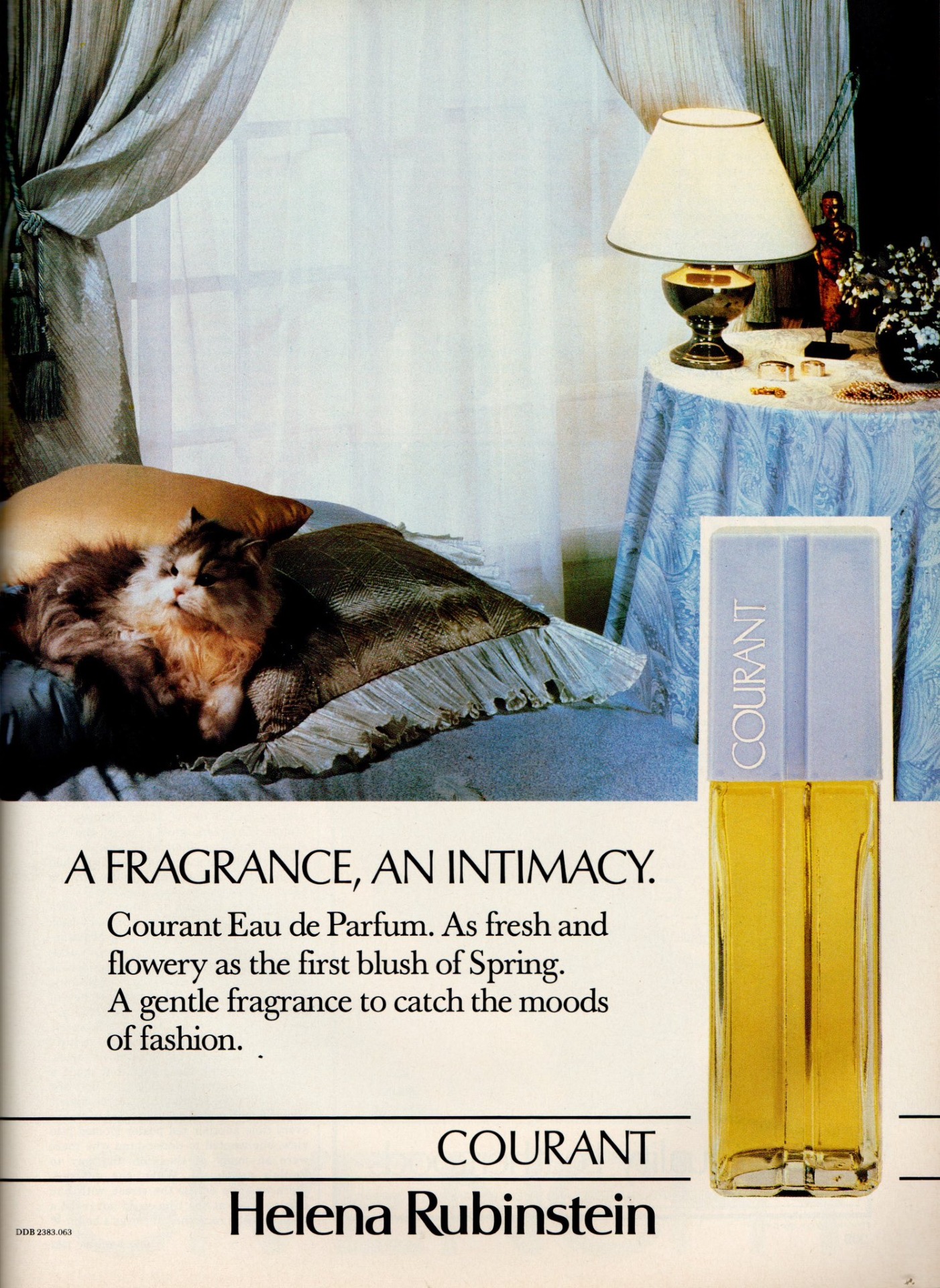 Shodou okolností jsem předevčírem v maminčiných pokladech objevila parfém značky HR – Courant. Vznikl až po smrti Heleny Rubinstein, v roce 1972, ale jeho kompozice připomíná éru vůní z dřívějších let. Existuje v několika koncentracích – od parfému až po toaletní vodu – a údajně byl formulován tak, aby se proměňoval podle tělesné teploty ženy, podobně jako její nálada. Překvapilo mne, jak má ten ošoupaný flakon i po letech jemný a silný rozprašovač. Úvod vůně je hořce květinově-zelený, trochu mýdlový – podobně jako původní Ivoire od Balmain. Zelené tóny postupně ustupují, objevuje se kořeněné srdce se špetkou olejnaté živočišnosti a vůně doznívá jako zemité spojení mechu a kůže. Výdrž je nekonečná.