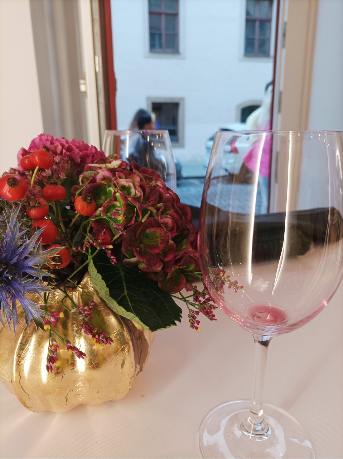 Ještě se sluší dodat, že slavnostní večer zpříjemnilo i malé pohoštění. O vínu pohovořila a naše vyschlá hrdla jimi svlažila paní Andrea Sedláčková ze společnosti Giorgo - Jiri Skvor. O hudební podkres se postarala DJ V. (Wolfgang) a překrásná květinová výzdoba byla z floristického ateliéru Tamsvigh.