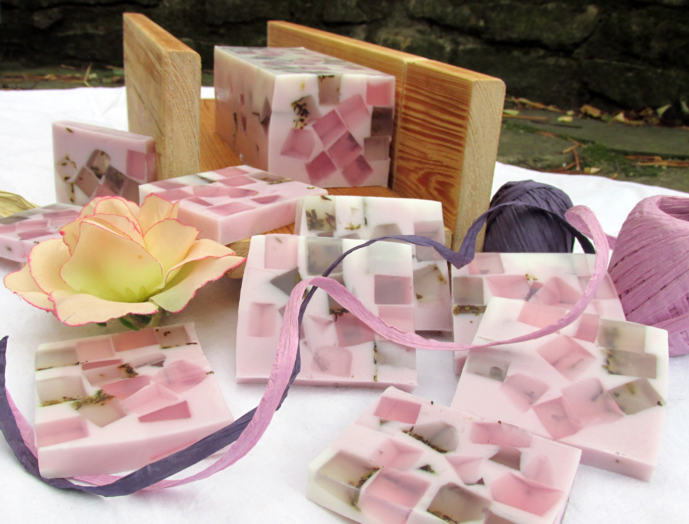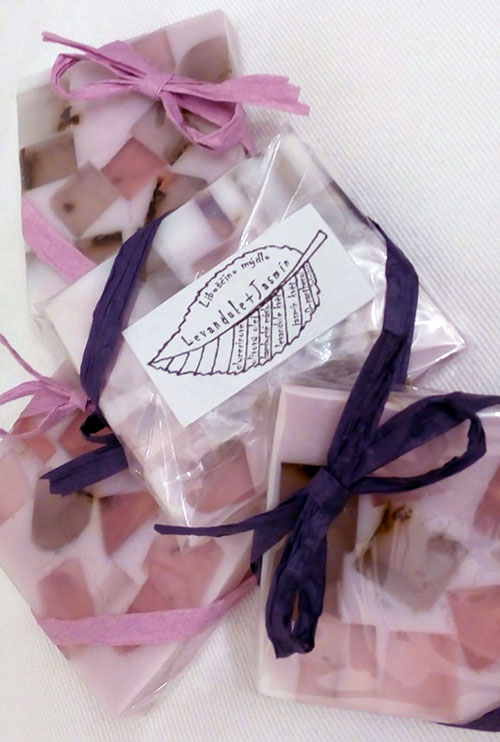 Výsledkem jsou glycerinová mýdla s olivovým olejem a bambuckým máslem s přidaným D-panthenolem a měsíčkovým extraktem. Ovoněla jsem je hlavně levandulí a jasmínem a taky pár kapkami vanilky, santalu a limetky. Poprvé jsem použila mýdlovou hmotu Crystal Suspending, která má umožňovat rovnoměrně rozptýlení kosmetických přísad v mýdle. Vyzkoušela jsem to s kvítky levandule a musím bohužel konstatovat, že to nefunguje. Opět kvítky plavou na hladině.