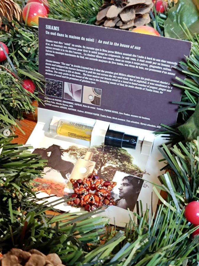 "Shams v arabštině znamená slunce. Legenda praví, že perský bůh Mitras za úsvitu nastoupil do svého zlatem pokrytého vozu a bičoval své koně, aby táhli slunce po obloze až do večera. Ale za soumraku ho spolkl muž, jen aby se za úsvitu vrátil k životu", takto Memo Paris doprovází parfém Shams (dnes Shams Oud) svým příběhem.