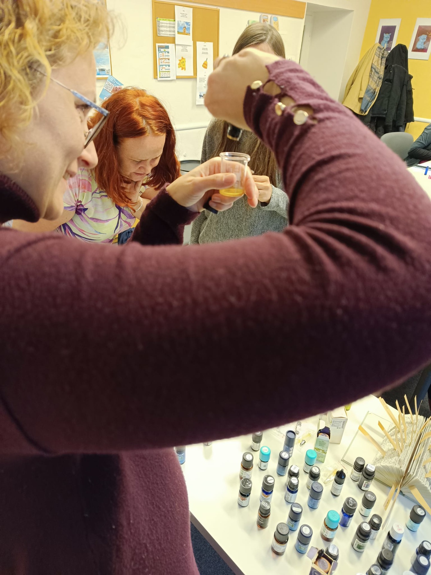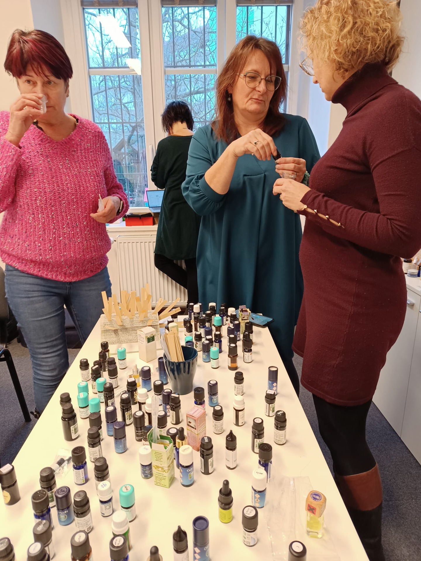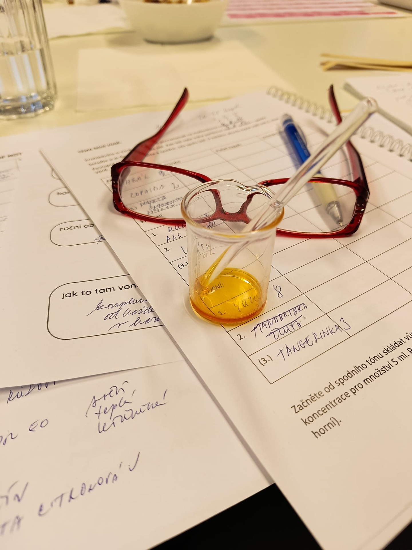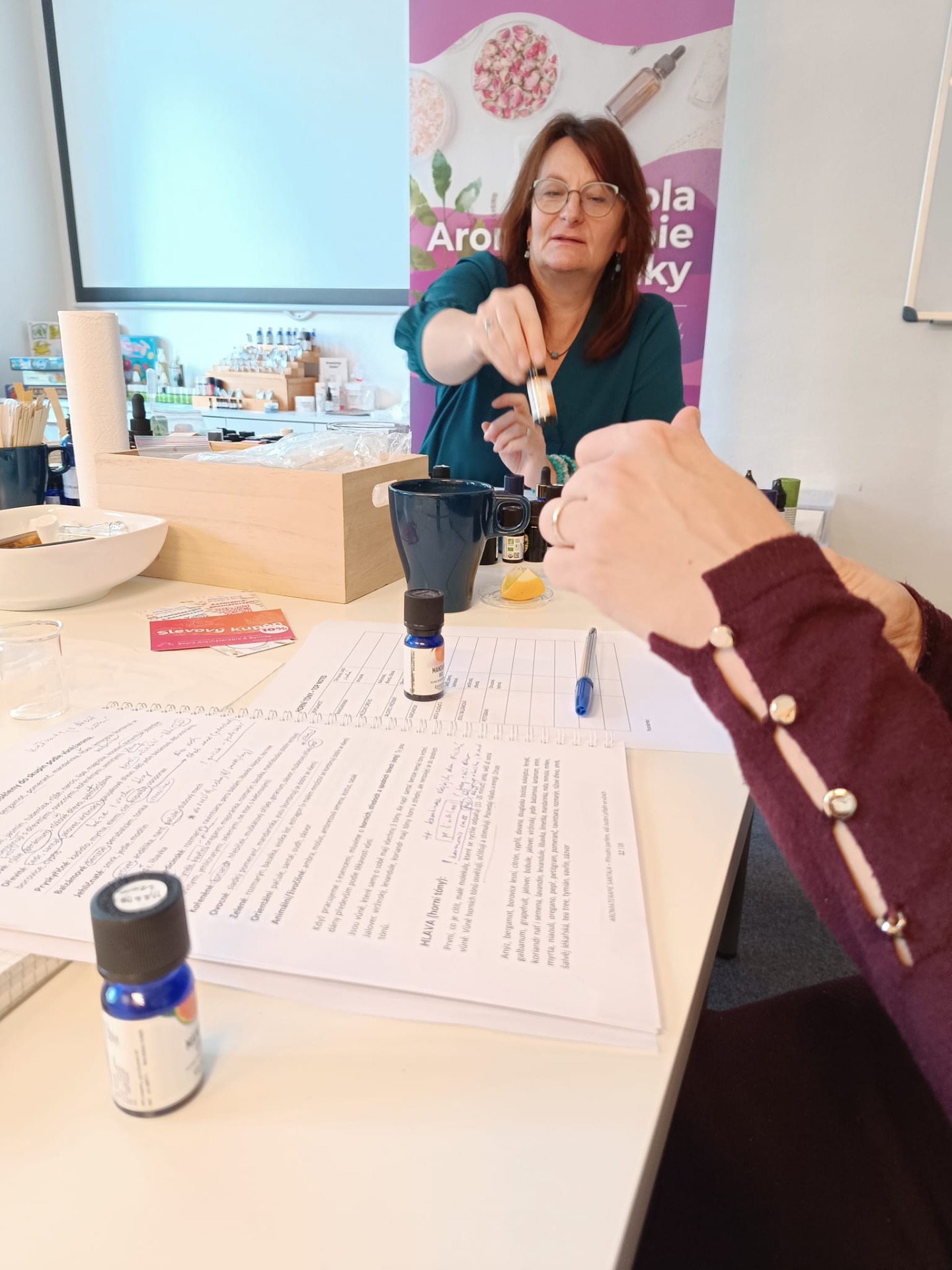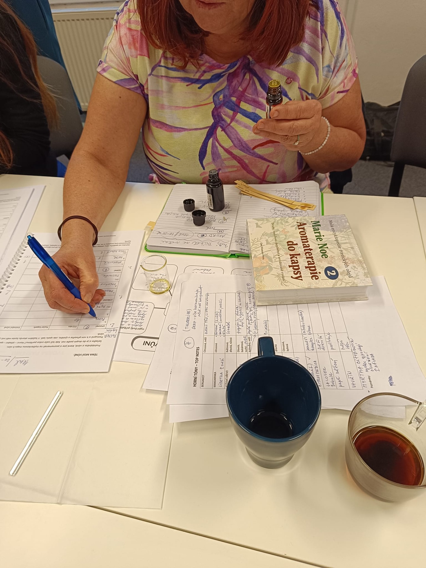 Jana Urbanová nám dala doporučení ke každé esenci si dopodrobna zapsat a posléze vrýt pod kůži, jak ji vnímáme, co si k ní představujeme. Lépe se nám potom zařadí do "šuplíčku" a my si její vlastnosti vybavíme při potřebě udělat vůni sladší, vzdušnější, dřevitější, těžší, jásavější apod.