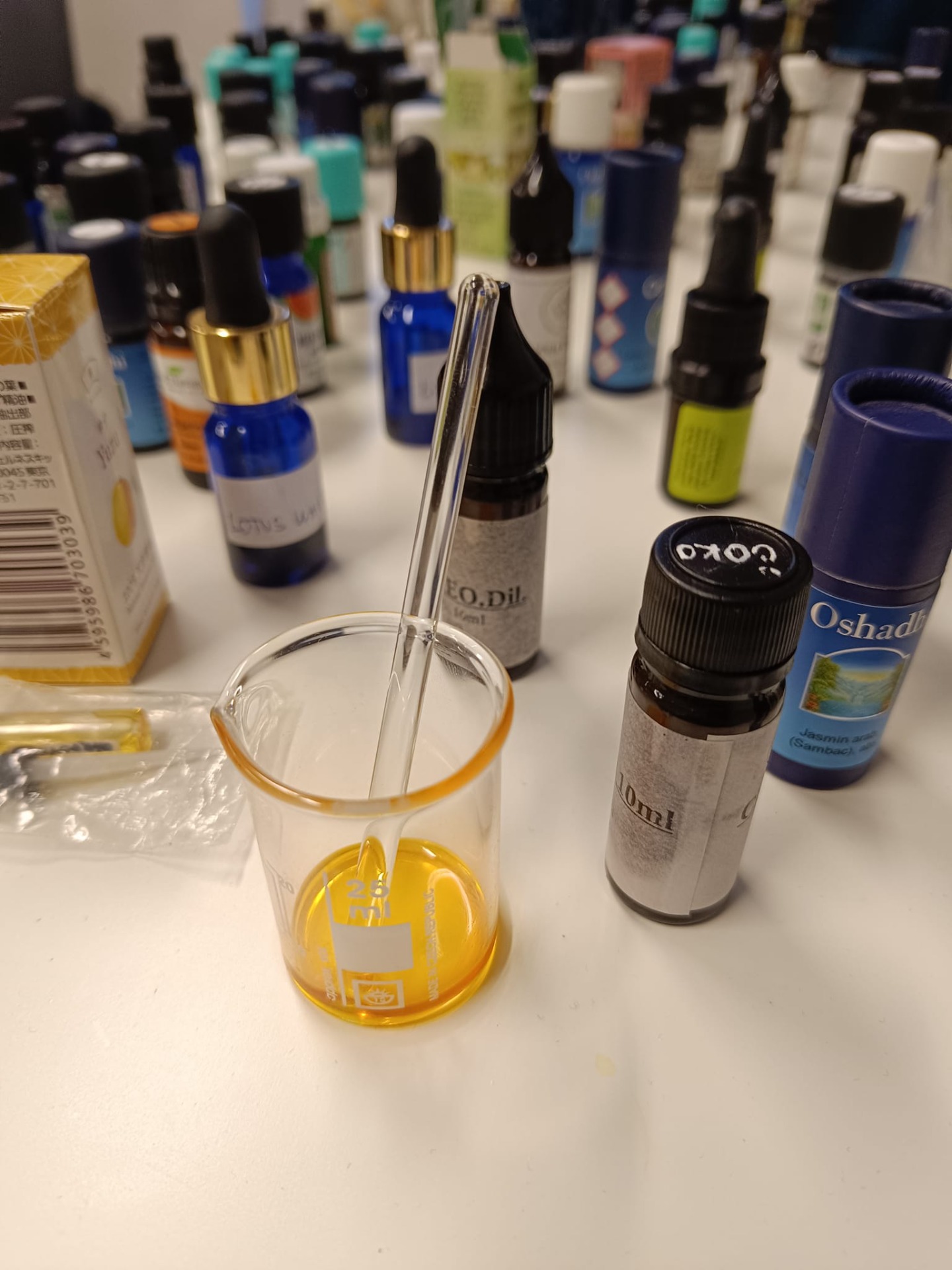 Vybrala jsem si ingredience. Jasné bylo trio - yuzu (které má komplexní citrusovou vůni), růže damašská absolue a copaiba balzám (který má trochu citrusový nádech, dobře fixuje a nepřebíjí ostatní vůně). Do hlavy jsem potom váhala mezi myrtou citronovou a žlutou mandarinkou, kterou se mi nepodařilo najít, tak jsem ji nahradila tangerinkou. Do základu jsem si byla jistá tabákem (příjemná suchá kouřová vůně) a pak jsem chtěla přidat nějakou ambrovou balzámovou složku, který by vůni zakulatila a osladila. Vyhrál styrax (zdál se mi krotší, než příliš živočišné - ambra a jantar, nebo příliš sladká benzoe). Ale do srdce k růži jsem nevěděla, jakou esenci zvolit. Když jsem zmateně popsala svůj záměr Janě Urbanové, navedla mne k vůni lípy, kterou bych si sama nikdy nevybrala. Postupně jsem přidávala esence, až to bylo ono, parfém mi voněl. Jana vůni zhodnotila jako milou, konstatovala, že se mi podařilo vytvořit vzdušnou růži. Měla jsem velkou radost.