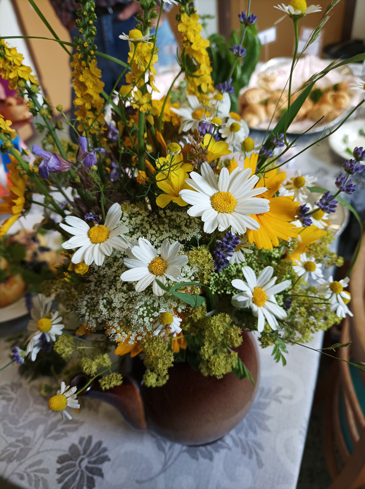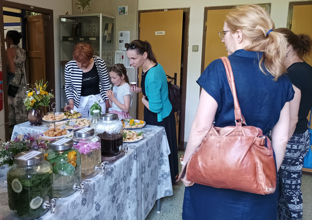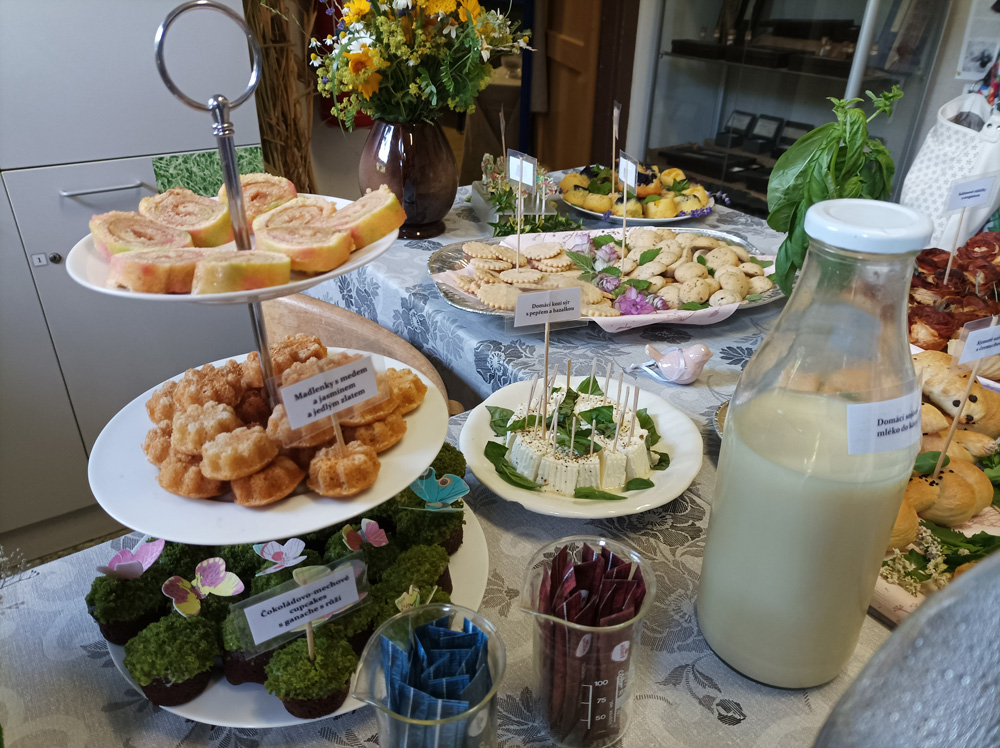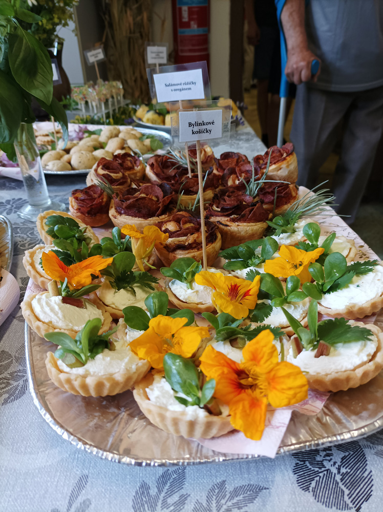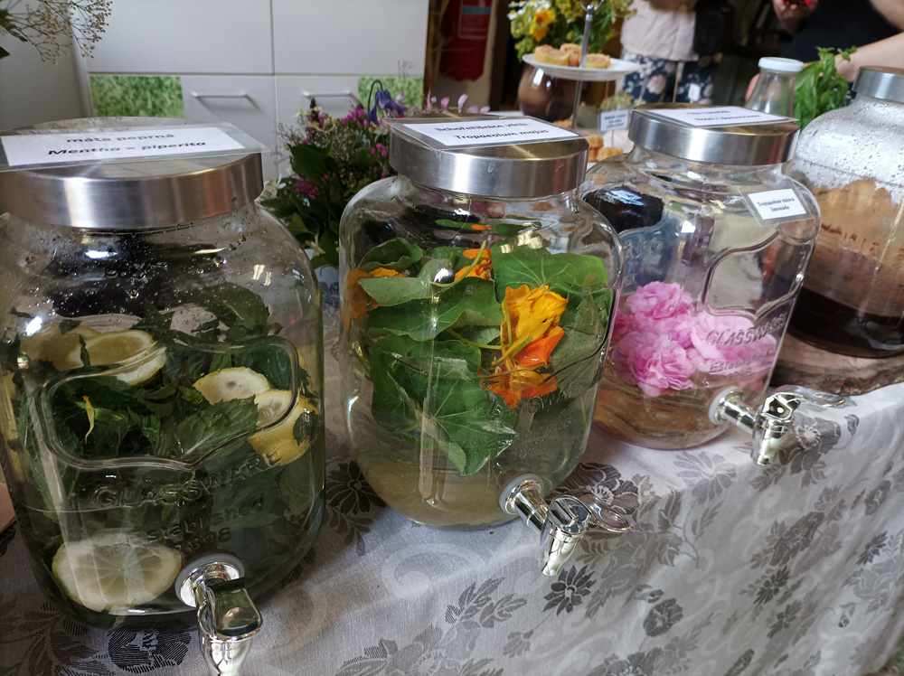 Součástí vernisáže bylo také tematické pohoštění s květinovou výzdobou. Pracovnice Centra se opravdu vyznamenaly, o jeho přípravu se prý spravedlivě podělily. Byla tu k ochutnání spousta dobrot, ve kterých byly použity jak bylinky klasické, tak ty méně známé, dokonce květiny. I sójové mléko bylo domácí ze zde vypěstovaných bobů. Přiznávám, dietu jsem porušila a ochutnala skoro vše. Fialková lízátka, kapkejky se špenátem a růží, madlenky s jasmínem a zlatem, meduňkové muffiny s borůvkami, linecké s anýzem, bezinkovo levandulové sušenky... ach ach ach. Poprvé v životě jsem jedla lichořeřišnici na luxusních bylinkových košíčcích, mňam! Z nápojů mi nejvíce chutnala trojnásobná růžová limonáda ochucená růžovým sirupem, růžovou esencí a ozdobená růžovými květy.