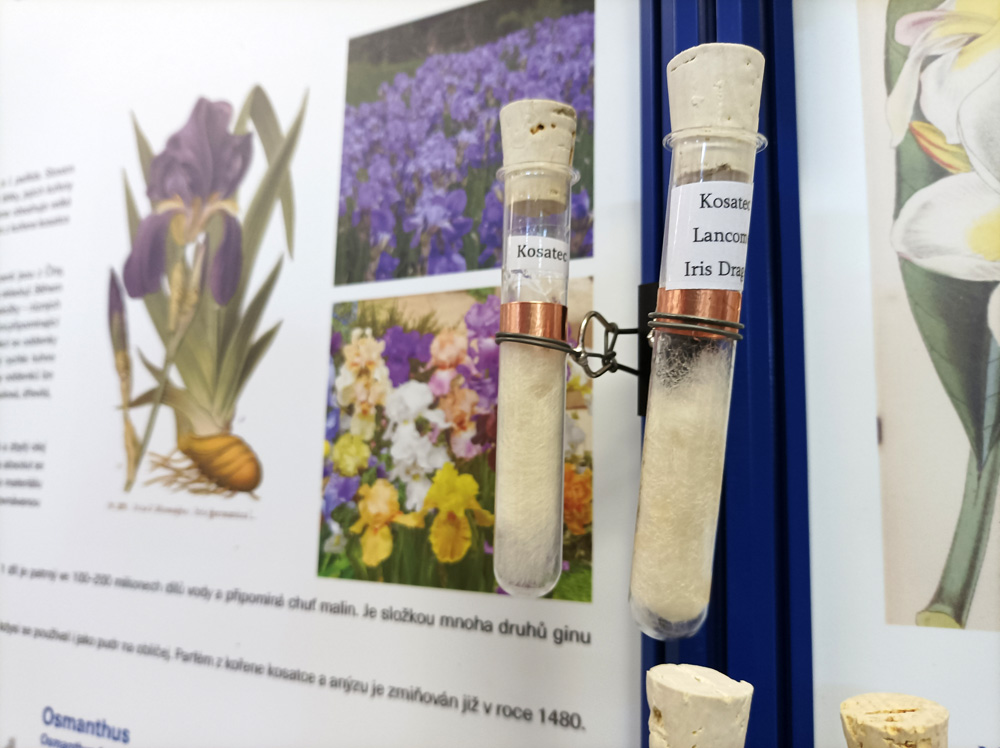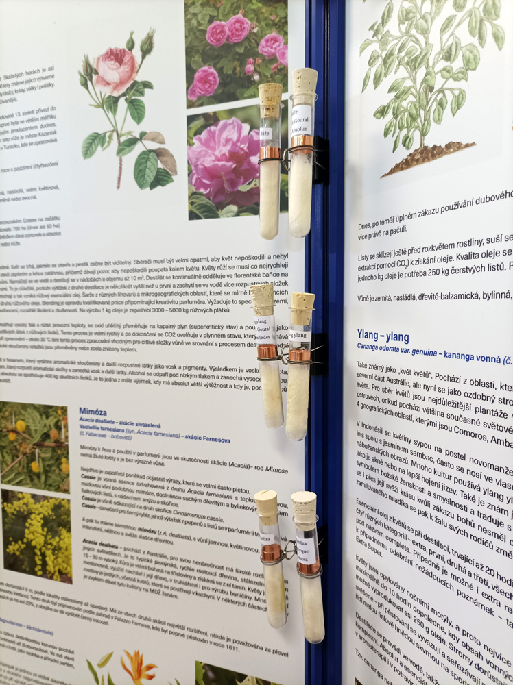 Prostudovat všechny panely detailně jsem ani nestačila, protože jsem se stále vracela ke zkumavkám. Jsou v nich velmi kvalitní esence (ptala jsem se). Poznala jsem to u esence karafiátu, který byl jako živý, a u kterého znám pouze jeho levnější podobu. Nejvíce mi voněla champaca a palo santo a nejvíce zapáchala vanilka s oudem. Větvičník mě překvapil velmi intenzivní zelenou barvou a vetiver přirozeností vůně. V úvodu výstavy nebyly ještě zkumavky s parfémy popsané, tak jsem mohla naslepo poznávat. Některé parfémy jsem trefila (Shalimar, u kterého ráda nosím jeho lehčí variantu), některé ne... a stydím se za to :-), třeba bílou Habanitu.